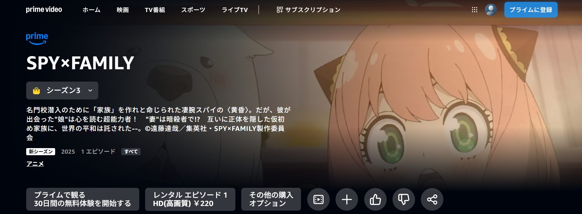 - アニメ「スパイファミリー」がAmazonプライムビデオ(アマプラ)で配信されるのか知りたい。