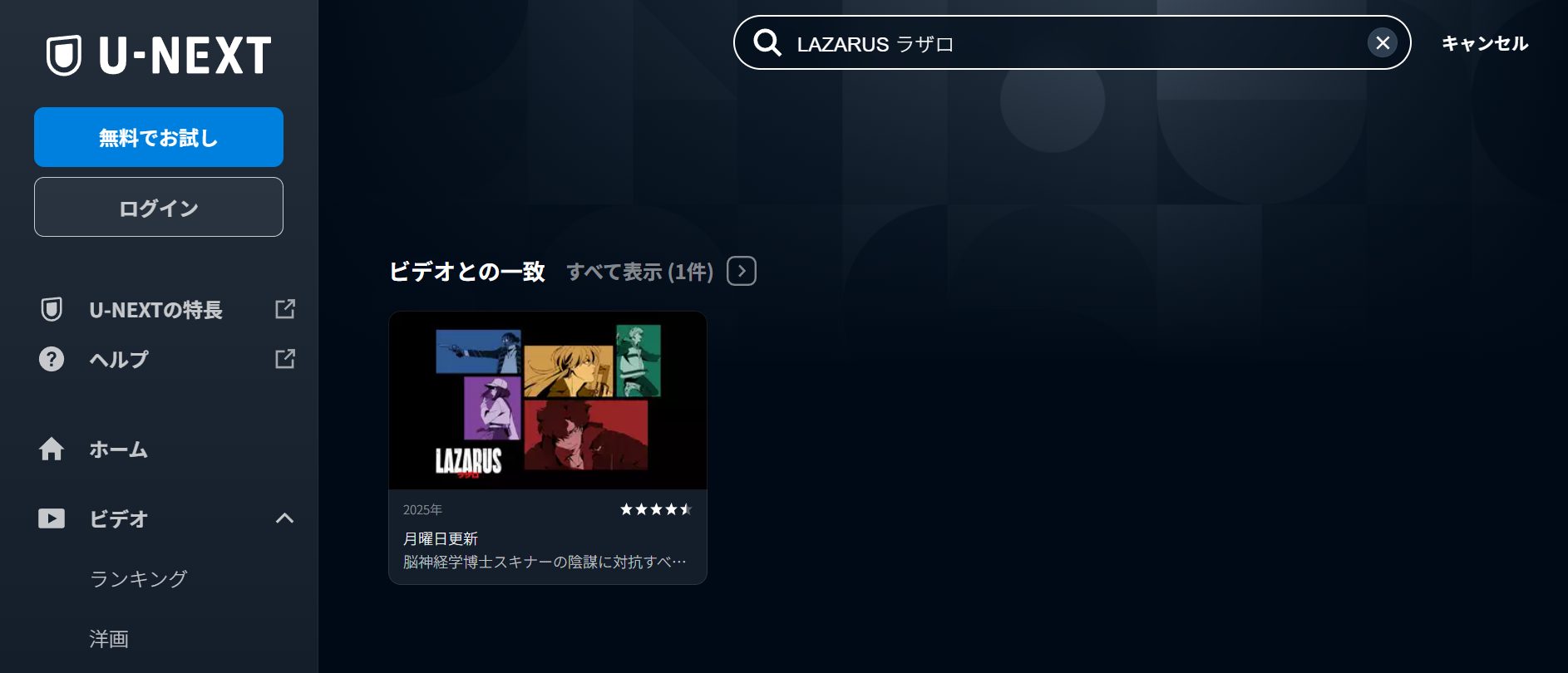 「U-NEXT」は「LAZARUS-ラザロ-」の見放題配信あり、しかもWEB最速で見れる