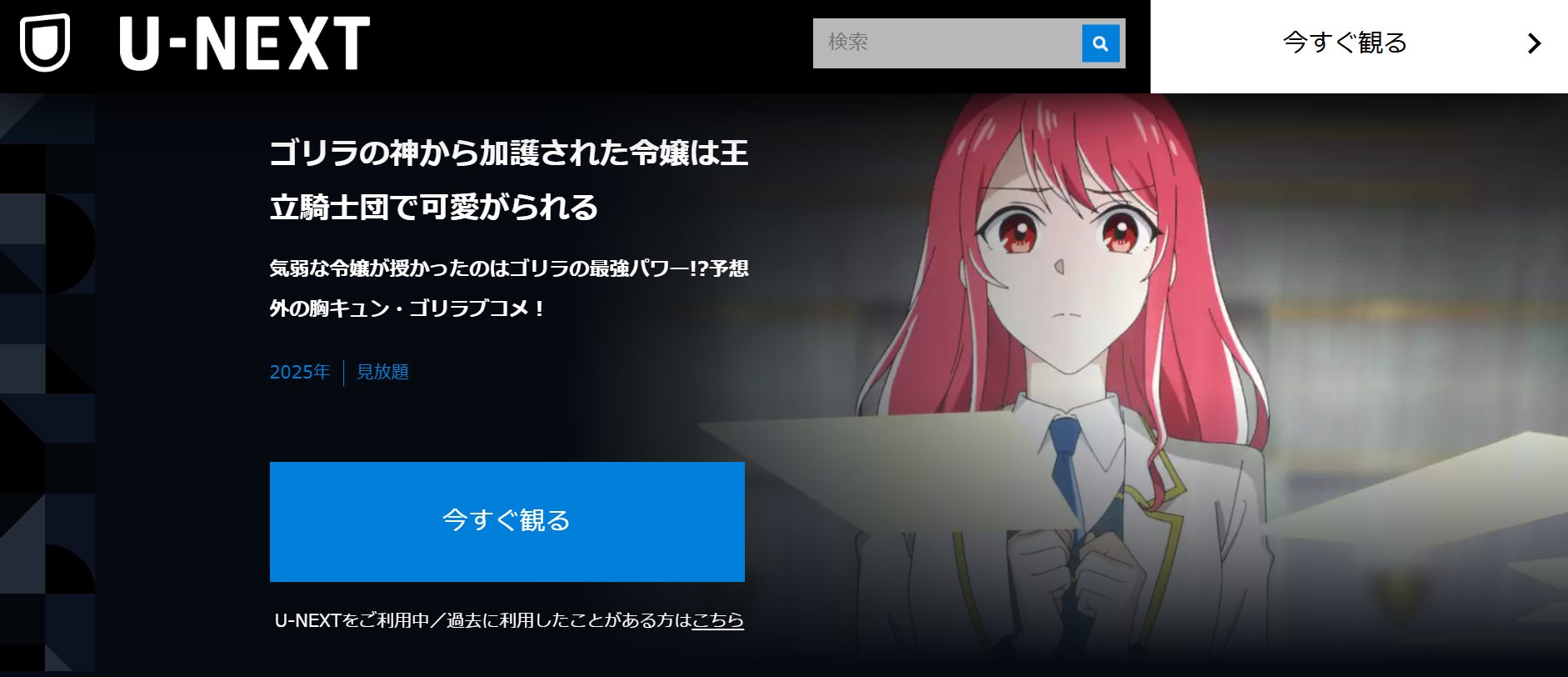 『ゴリラの神から加護された令嬢は王立騎士団で可愛がられる』を最速で見るなら「U-NEXT」がおすすめです!