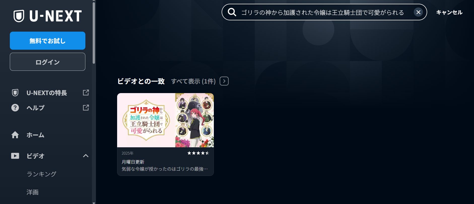 続いて、Amazonプライムビデオで「ゴリラの神から加護された令嬢は王立騎士団で可愛がられる」が視聴できるかをご紹介します。