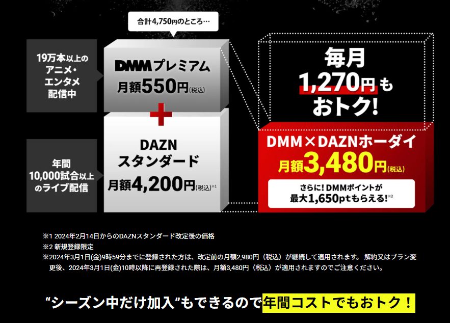 DAZNスタンダードの通常料金が月額4,200円であるのに対して、DMMとのセットプランでは3,480円(税込)で提供されています。