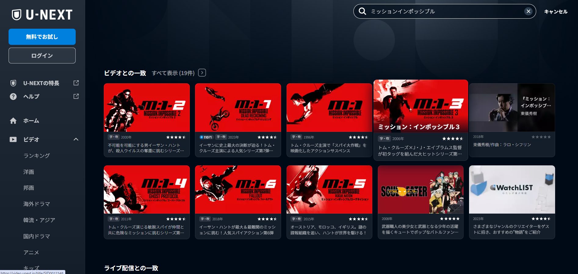 そして、以下が「U-NEXT」の映画『ミッションインポッシブル』シリーズのラインナップとなります。
