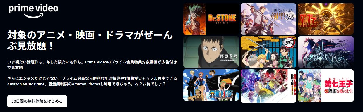 最大30日間で「Amazonプライムビデオ」を無料で試せるので、内容や操作感をじっくりとチェックできます。
